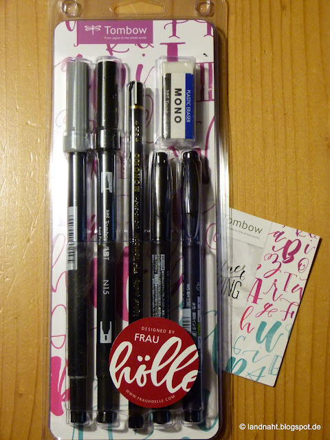 Das Stifteset von Tombow beinhaltet einen sehr harten wischfesten Bleistift zum Erstellen von Hilfslinien, einen Radiergummi, einen Dual Brush Pen mit einer flexibler Pinselspitze für dicke kurvige Buchstaben und einer feinen Spitze für Details oder Druckbuchstaben in schwarz, einen Dual Brush Pen in grau für Schattierungen, einen Kalligraphie-Stift mit feiner Pinselspitze für feine Buchstaben und einen schwarzen Twin-Marker mit zwei verschieden starken Spitzen für Umrandungen.